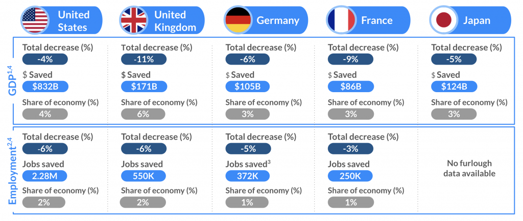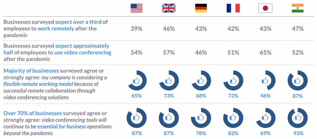 Enquanto os países ao redor do mundo lutavam contra os bloqueios, as pessoas rapidamente adotaram soluções de trabalho remoto e videoconferência. Por meio da implementação rápida e eficaz do trabalho remoto, as empresas nesses países foram capazes de economizar dinheiro e empregos que podem ter sido perdidos como resultado da pandemia. Nos Estados Unidos, por exemplo, a capacidade de trabalhar remotamente ajudou a salvar 2,28 milhões de empregos.
