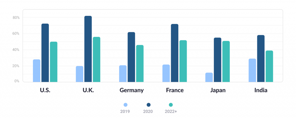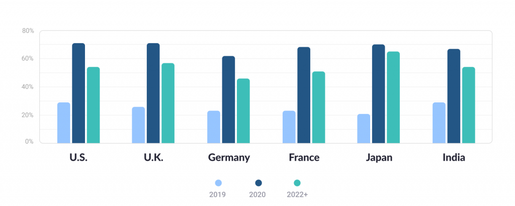 Para ver como as soluções de comunicação de vídeo afetam a maneira como as pessoas trabalham, tanto agora quanto no futuro, o aspecto da pesquisa do relatório pediu aos entrevistados que estimassem que proporção de funcionários em sua empresa usaram soluções de videoconferência em 2019, 2020, e que deverá acontecer em 2022. Os resultados foram agrupados por empresa e empresas de pequeno a médio porte (SMB). Como podemos ver, as empresas esperam que o uso de videoconferência permaneça significativamente elevado após a pandemia em comparação com 2019.
