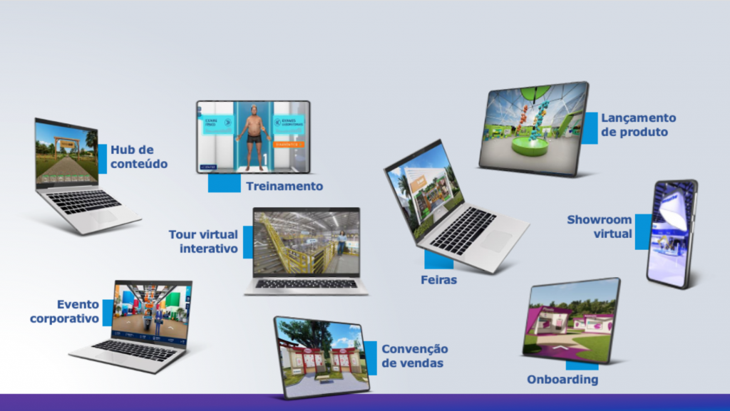 Com a nossa solução de Eventos, Shows e Serviços no Metaverso você pode espaços virtuais 3D emulando ambientes físicos na internet. Os segmentos de varejo, educação, saúde, finanças e entretenimento  podem usar o Metaverso para a realização de feiras, reuniões estratégicas, hubs de conteúdo, treinamento, convenções, shows, dentre outros ambientes. O principal benefício destes setores é a possiblidade de utilizar a tecnologia para apresentar produtos e soluções de forma mais dinâmica e sensorial. Outra vantagem de utilizar essa tecnologia é apresentar produtos e soluções de forma mais sensorial e dinâmica.