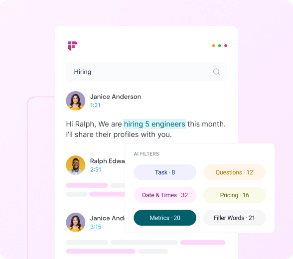 Diferente da concorrência, que são mais focados na gravação de reuniões, o Fireflies.ai transforma suas reuniões em insights acionáveis, detecta padrões de conversa e sugere melhorias para o engajamento da equipe com mais de 40 IAs para Vendas, Marketing, Engenharia, Projetos, Suporte, RH, Customer Sucess, Financeiro, Saúde e muito mais.