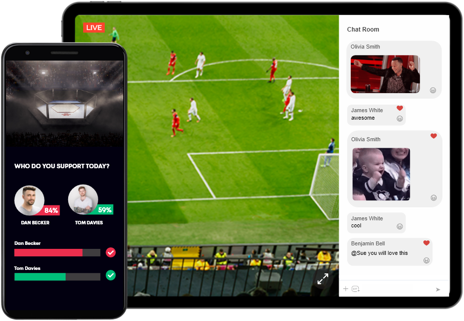- Aumente a interação do espectador ao vivo com ferramentas de engajamento como perguntas e respostas, enquetes e bate-papo com o público.